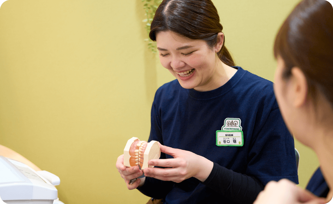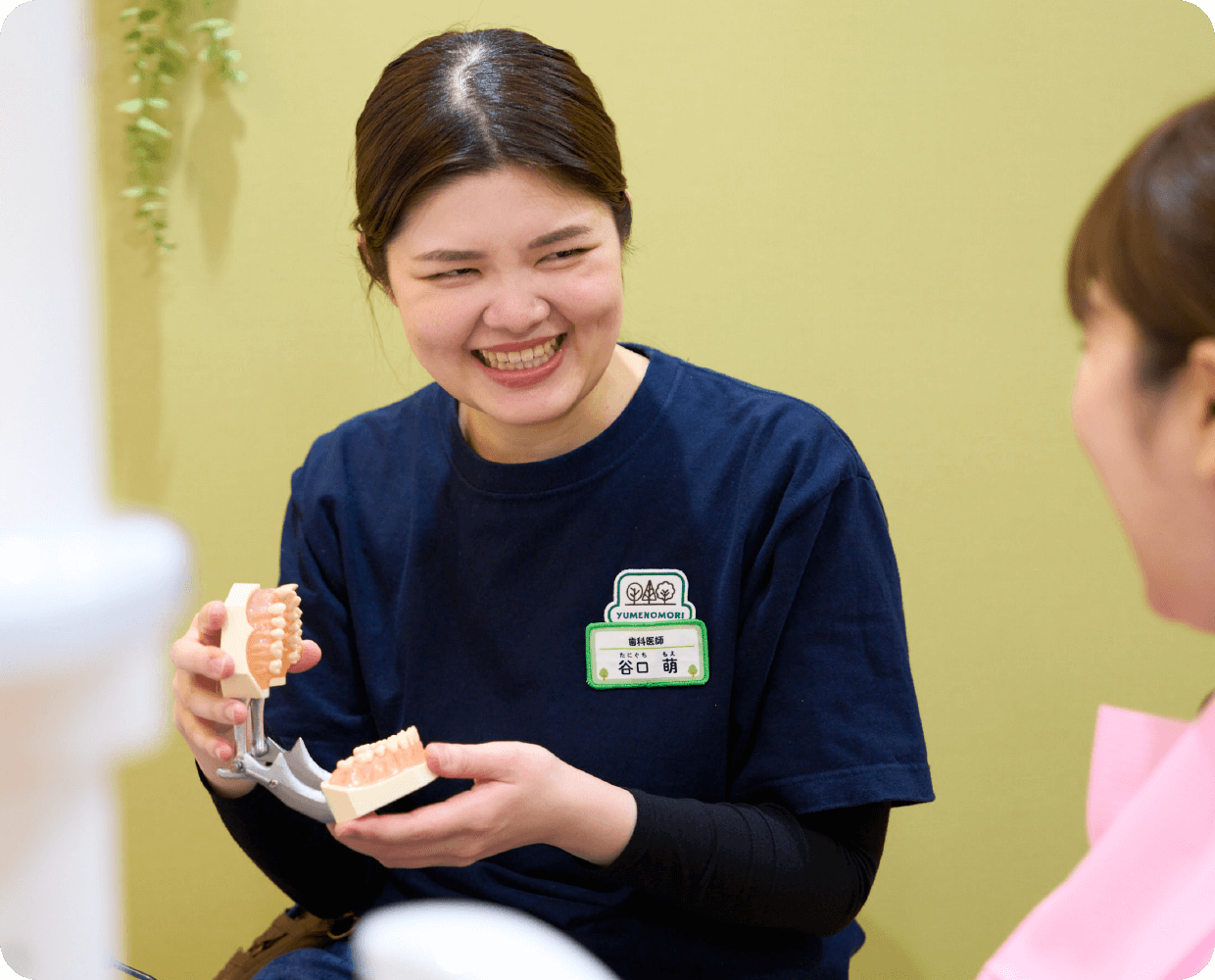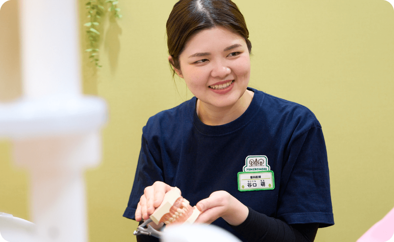以前は比較的小規模な歯科医院で働いていましたが、患者様の年齢層が広く、さまざまな治療に対応している規模の大きな歯科医院での勤務を希望し、ゆめの森歯科で働かせていただく運びとなりました。